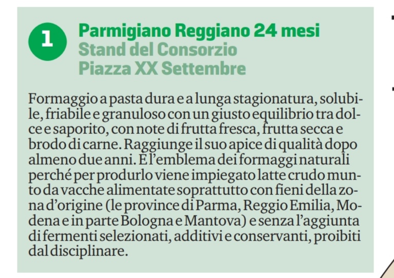 Tra gli eventi più attesi c’è poi la cerimonia di apertura della forma di Parmigiano Reggiano con il tradizionale metodo dei coltelli che si terrà venerdì 20 settembre alle ore 13.00 e domenica 22 alle ore 18.00. Il calendario delle iniziative sarà completato dalle tavole rotonde sulle biodiversità e dalle degustazioni che vedranno protagonisti i caseifici produttori di Parmigiano Reggiano, presenti a Bra, i quali introdurranno la propria realtà e offriranno assaggi di prodotto.