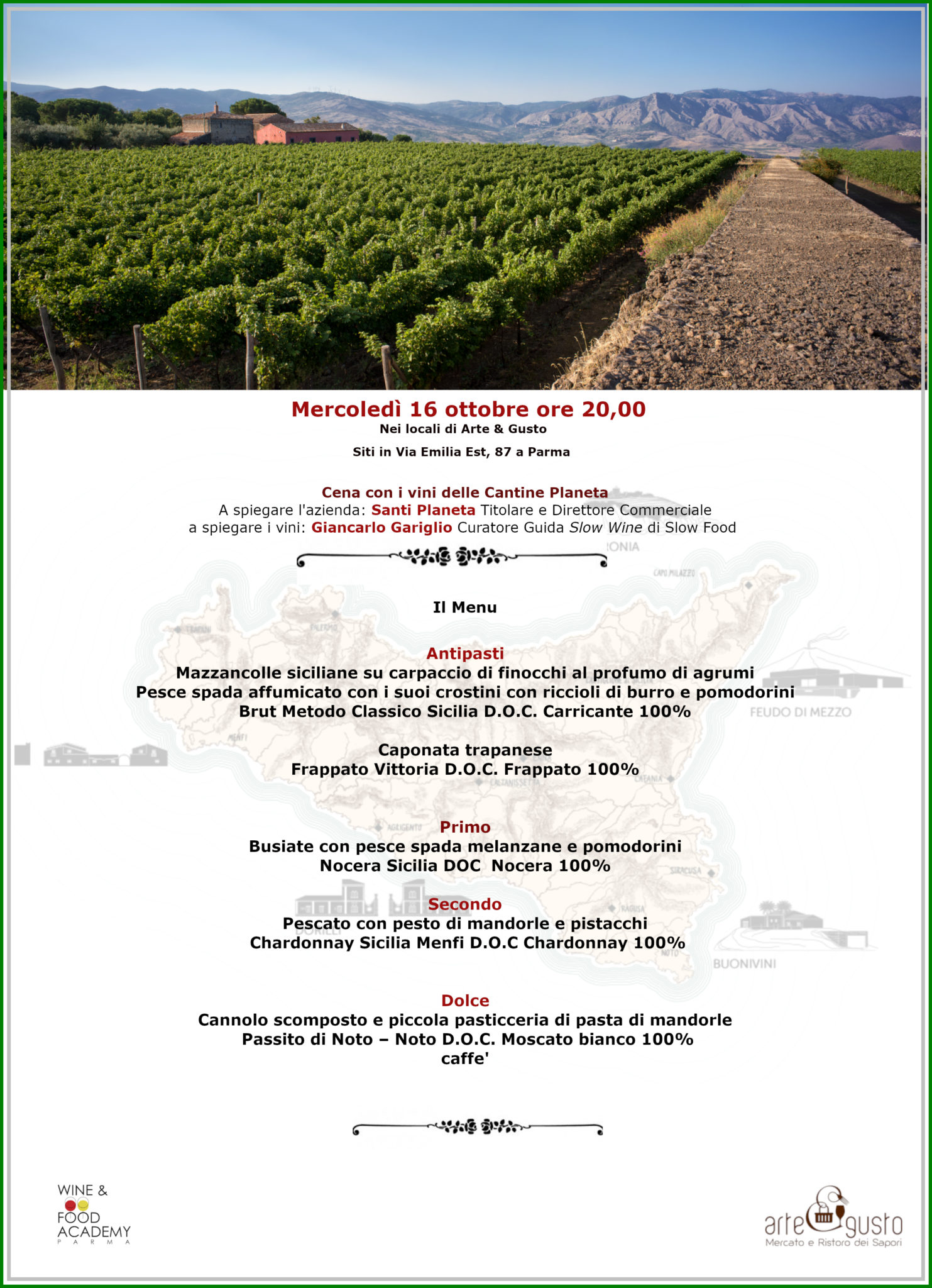 Spetterà poi alla brigata di Arte & Gusto, guidata dallo Chef Alfonso Francese, il compito di interpretare questi sapori di terre lontane, unite al piacere per la convivialità e la buona tavola, preparando un menù da abbinare ai vini del territorio protagonista della serata.