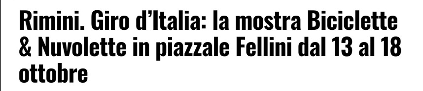 Si è aperta ieri a Rimini. È un lungo percorso, con una sorpresa a ogni tappa, quello della mostra “Biciclette & Nuvolette”, la mostra organizzata da Cartoon Club, Festival Internazionale del Cinema d’Animazione, Fumetto e Games di Rimini, che sarà visitabile dal 13 al 18 ottobre (estendo quindi la durata di allestimento inzialmente previsto) nel Foyer della palazzina Roma in Piazzale Federico Fellini (entrata libera).