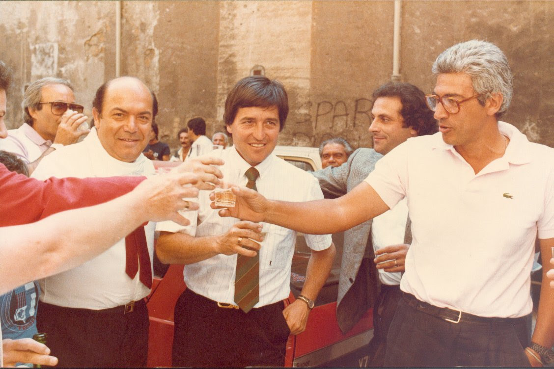Il regista Sergio Martino, sul set de “L’allenatore nel pallone”, brinda con Lino Banfi e “Picchio” De Sisti. Alle sue spalle, Andrea Roncato