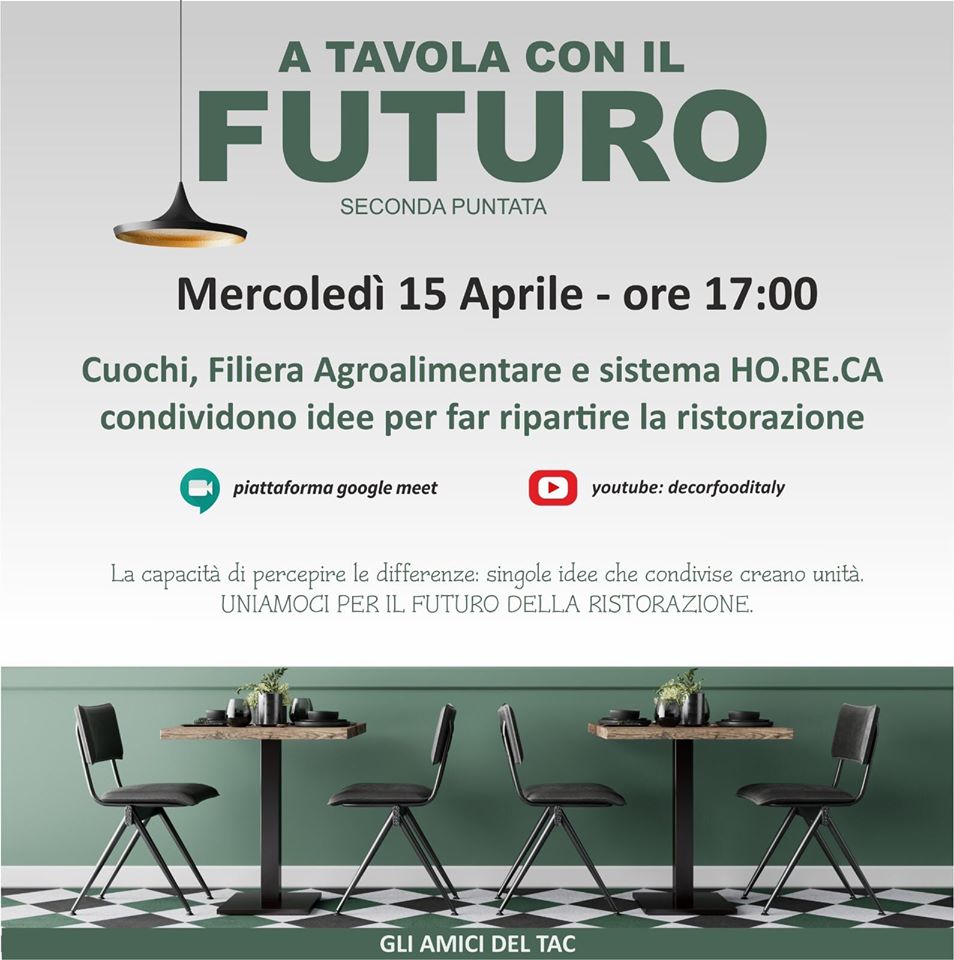 Queste sono solo alcune delle domande e delle richieste che il mondo della ristorazione avanza alle istituzioni e alle associazioni delle categorie per far ripartire il settore dopo l’emergenza sanitaria. E saranno anche i temi alla base della secondo appuntamento (il primo si è svolto lo scorso mercoledì) discussione che si terrà mercoledì 15 aprile alle ore 17 in un “incontro a distanza” sul tema “A tavola con il Futuro”.