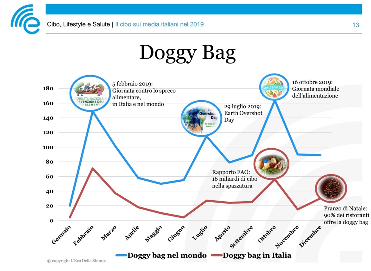 Infine, il Festival è strettamente impegnato sui grandi temi di attualità che riguardano contenuti alimentari. Nel corso del 2019, complice una generale crescente sensibilità verso i temi della sostenibilità, il tema dello spreco alimentare ha iniziato a farsi spazio tra i contenuti. Appena un paio di settimane fa, presentando la V edizione, gli organizzatori del Festival hanno lanciato una petizione su Change.Org per rendere obbligatorio l’uso della “Food Bag”, (leggere su Informacibo) la scatola che ogni ristoratore dovrebbe consegnare ai clienti per portare a casa il cibo pagato e non consumato. Un tema non ancora così sentito: di “doggy bag” si è parlato 321 volte in Italia, a fronte di oltre 1000 nel mondo.