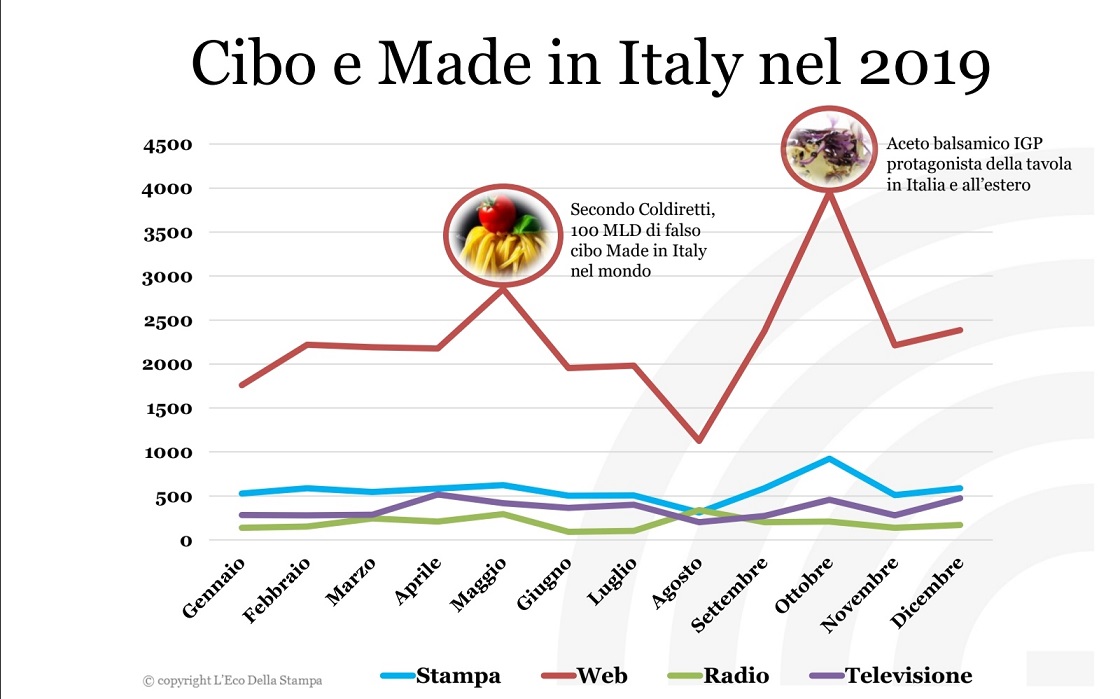 Nel 2019 il cibo ha rappresentato il 13,5% dell’informazione legata al tema del Made in Italy, che ha prodotto in totale quasi 300mila pubblicazioni.