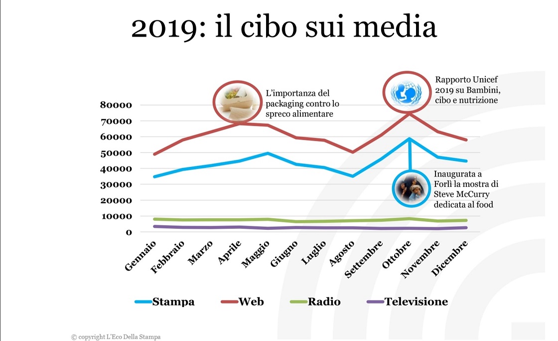 Nel corso del 2019, stampa, web, tv e radio italiani si sono occupati 1.373.312 volte dello stesso argomento: il cibo 2019 (web: 729.357; stampa: 524.488; radio: 88.555; tv: 30.912). Questo vuol dire che si è parlato più di cibo che di politica.