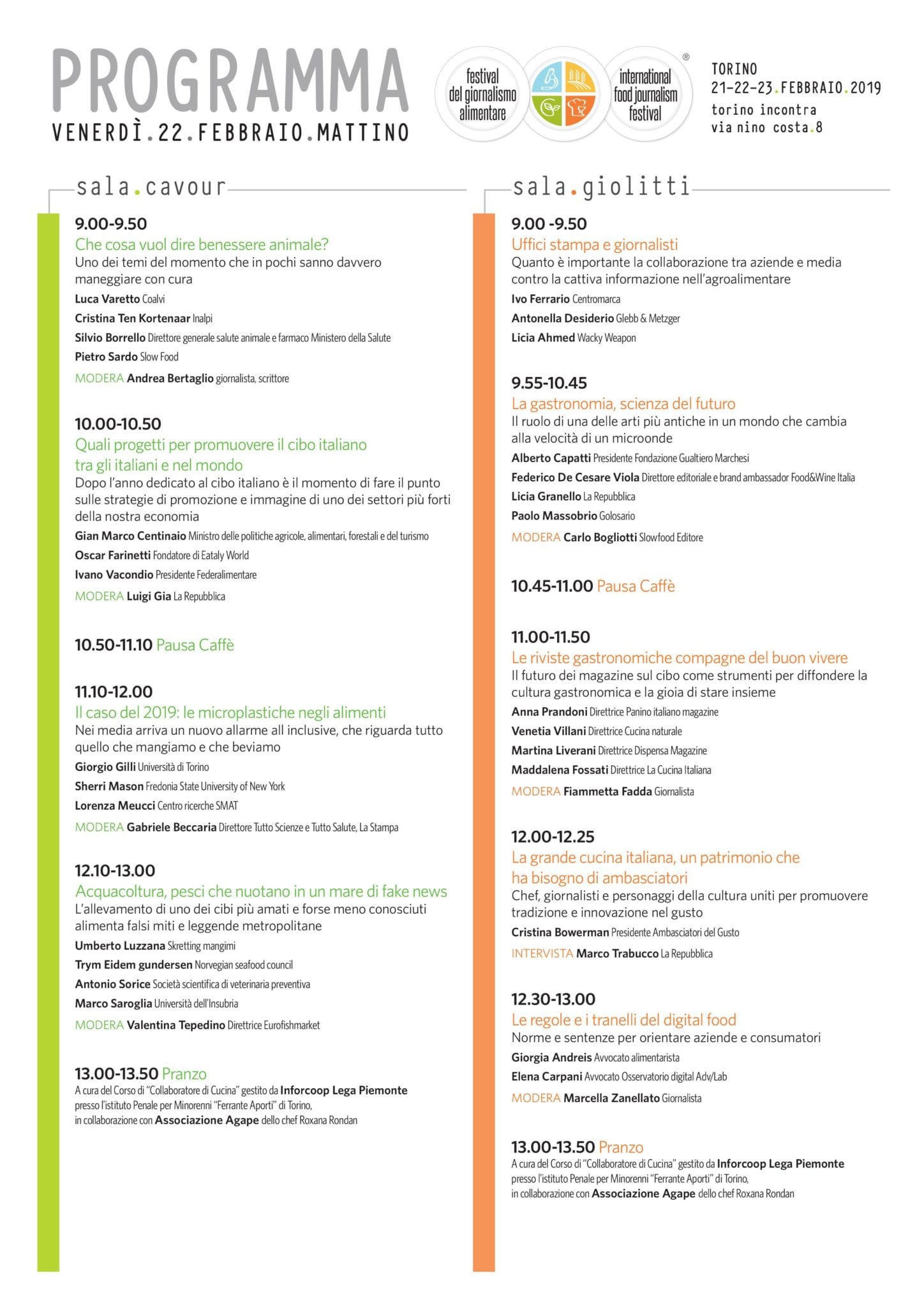 Ai tavoli di discussione si affiancheranno i laboratori pratici, quest’anno ancora più numerosi rispetto alla passata edizione per rispondere all’interesse crescente del pubblico del Festival che chiede più formazione per il proprio lavoro. Grazie alla collaborazione con il Laboratorio Chimico della Camera di commercio di Torino, l’Istituto Zooprofilattico di Piemonte Liguria e Valle d’Aosta, INALPI, il Consorzio di Tutela della Mozzarella di Bufala Campana DOP, Centrale del Latte di Torino, Eurofishmarket, Skretting, Assoittica e FoodLab, i partecipanti avranno modo di sperimentare pratiche e di acquisire conoscenze utili per chi scrive di cibo.