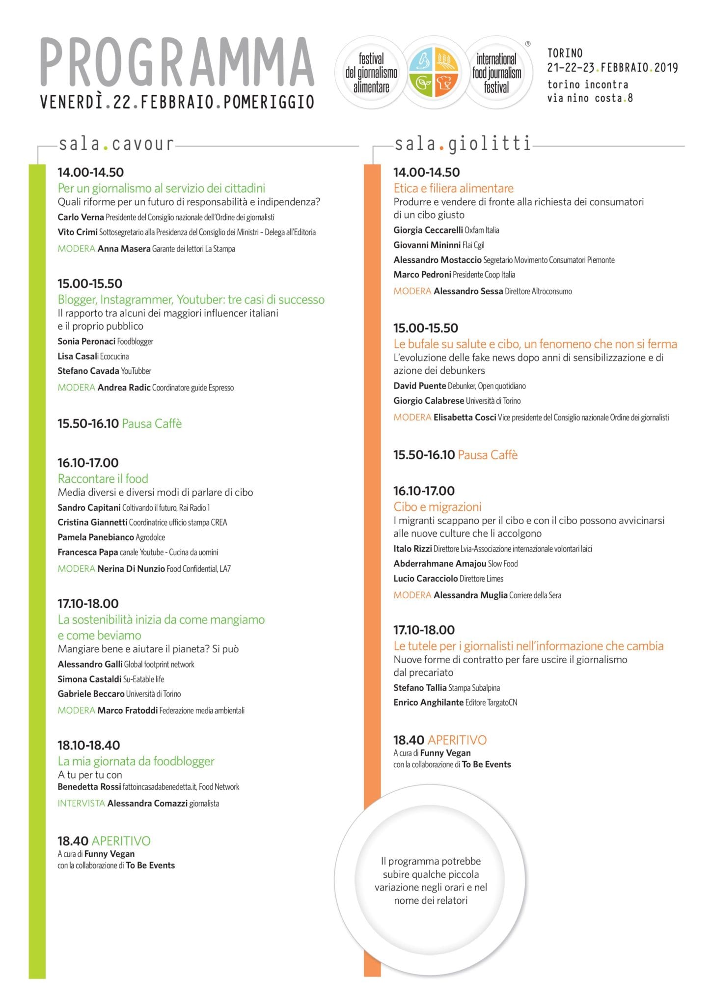 L’importanza di condividere esperienze sarà poi illustrata da alcuni rappresentanti della “Rete del Festival del Giornalismo Alimentare”, dal network europeo EIT Food e dalla chef stellata Cristina Bowerman, presidente degli Ambasciatori del Gusto. Voci di rilievo giungeranno anche dal mondo dei foodblogger, degli youtuber e degli instagrammer, attraverso casi di successo e riflessioni sul rapporto con il proprio pubblico. Tra questi, Benedetta Rossi, in testa alle classifiche tra le influencer nel food, che concluderà i lavori di venerdì 22 febbraio raccontandoci la sua “giornata da foodblogger”.