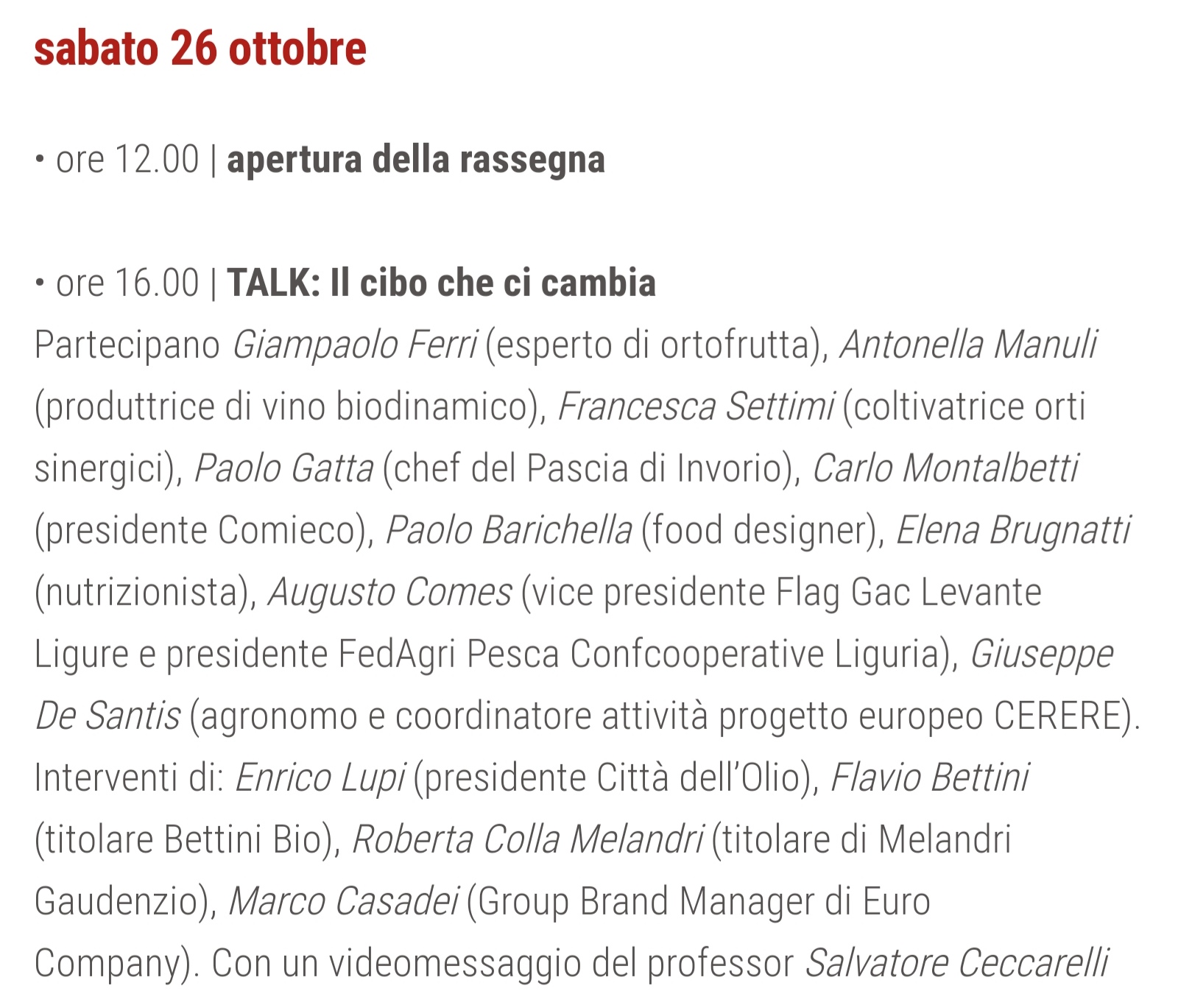 La rassegna gastronomica ideata da Paolo Massobrio e Marco Gatti, rappresenta un’istantanea realistica e attuale sul mondo del cibo, partendo dall’agricoltura, posta di fronte ai cambiamenti climatici, e dai prodotti fino a toccare l’ambito della ristorazione. (La presentazione svoltasi lunedì scorso su Informacibo).