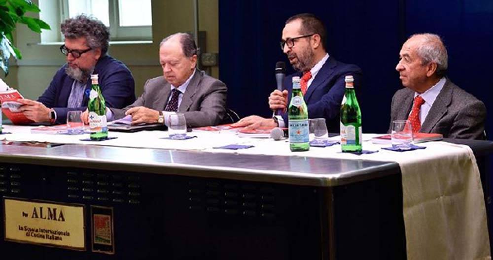 La presentazione del volume, «Alma, un sogno in grande. La ricetta di un successo», alla Reggia di Colorno con Albino Ivardi Ganapini, Andrea Grignaffini, Enzo Vizzari, direttore della Guida Espresso e Claudio Rinaldi, vicedirettore della «Gazzetta di Parma»