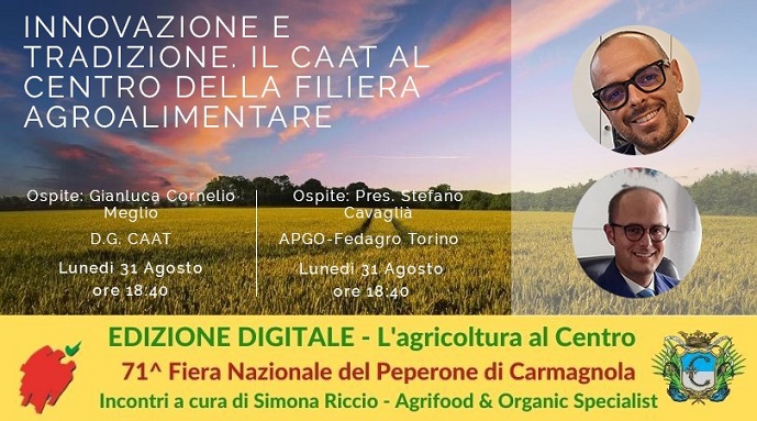 Nel panel “Edizione Digitale – L’agricoltura al Centro”, Simona Riccio ne parlerà direttamente dal Caat, durante le normali attività lavorative, con Gianluca Cornelio Meglio – Direttore Generale del Centro e Stefano Cavaglià – Presidente dell’Associazione Piemontese dei Grossisti Ortofrutticoli (APGO-Fedagro Torino).