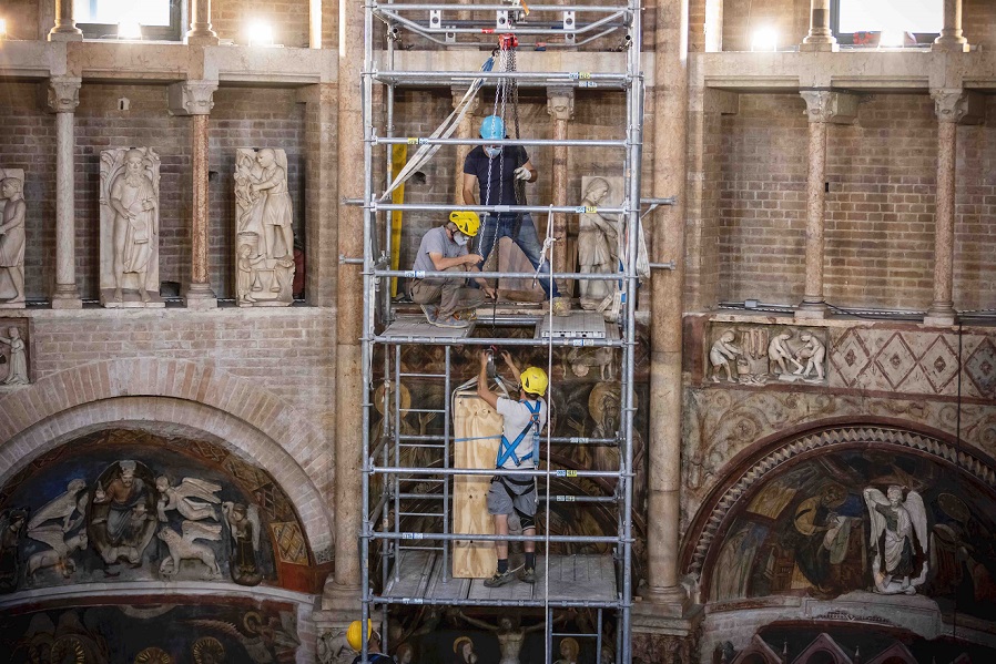Un evento storico visto che le sculture – posizionate sul loggiato del Battistero a 7,5 metri d’altezza – sono state portate a terra e potranno essere ammirate da vicino dai visitatori grazie ad un’iniziativa della Diocesi in collaborazione con la Fabbriceria del Duomo, l’Ufficio diocesano beni culturali ecclesiastici e la Soprintendenza archeologia e belli arti di Parma e Piacenza con il contributo di Fondazione Cariparma, Fondazione Monte Parma, Comitato per Parma 2020 e Comune di Parma.