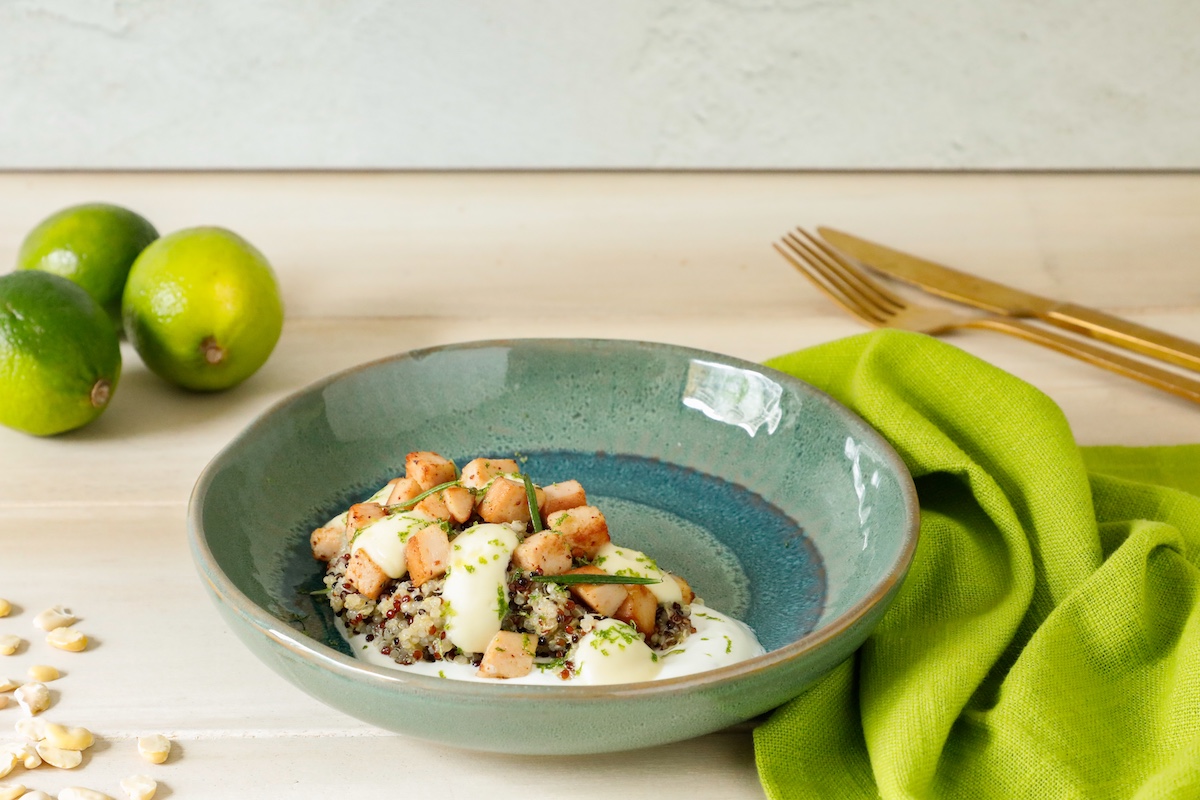 Una bowl proteica completa, fresca e nutriente, perfetta per chi pratica sport con regolarità e cerca un pasto bilanciato che supporti energia, recupero e costruzione muscolare. Pronti a preparare, con lo chef Nicholas Bianchini e la nutrizionista Federica Carracillo, un piatto unico a base di quinoa tricolore, fesa di tacchino marinata e glassata, mousse di fave in agrodolce e crema allo yogurt greco, lime e rosmarino.