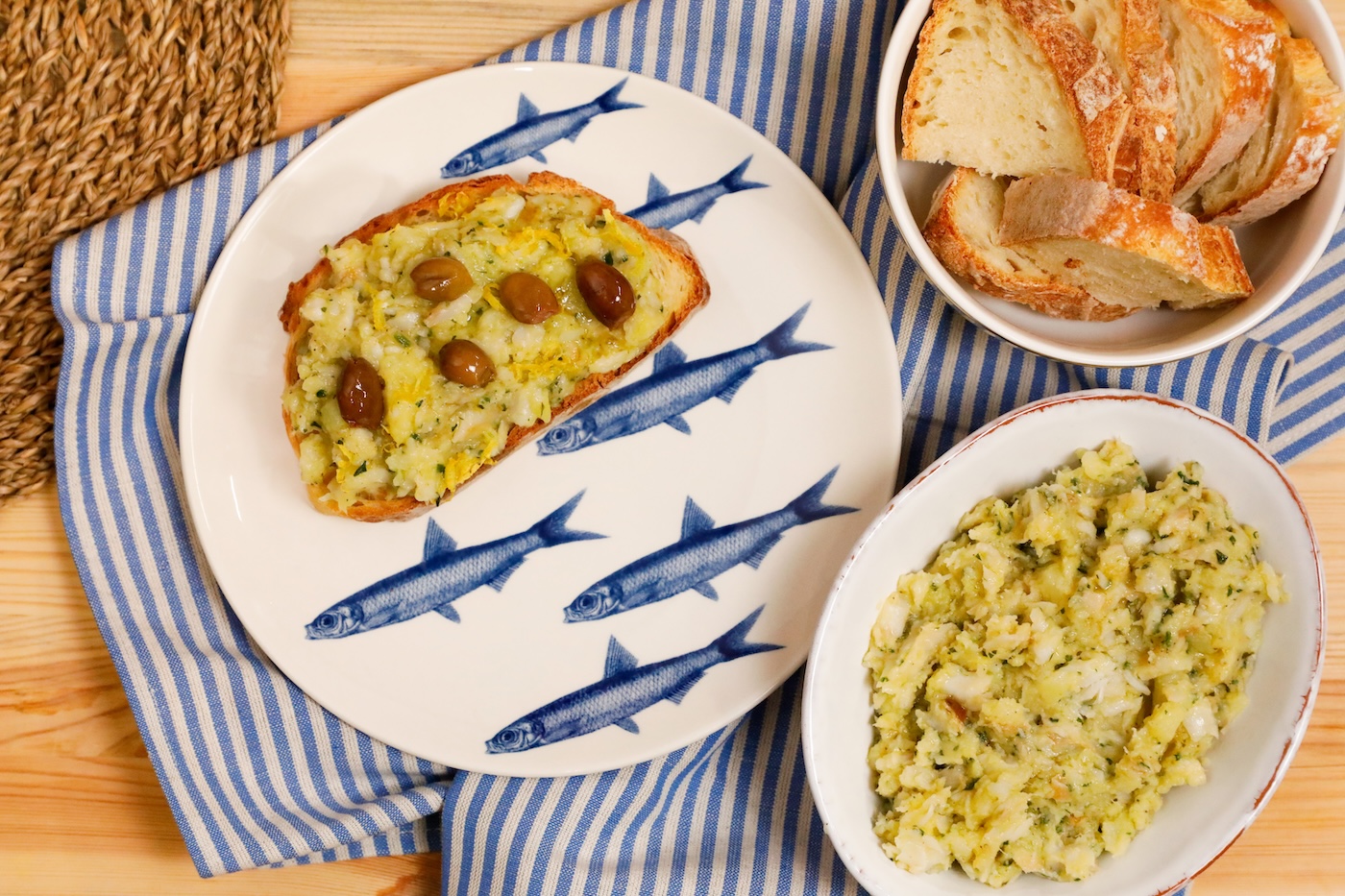 Servi il brandacujun tiepido o a temperatura ambiente, guarnendo con le olive taggiasche e accompagnando con crostoni di pane casereccio tostato.