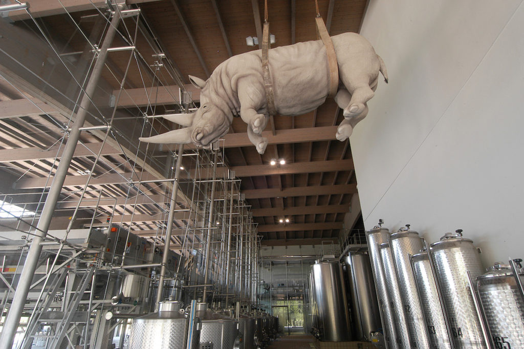 La collezione continua anche all’interno con l’irriverente “Peso del Tempo Sospeso” di Stefano Bombardieri: un rinoceronte di dimensioni naturali che ha il compito di proteggere con la sua imponenza la sala di vinificazione; “Water in Dripping”, opera del cinese Zheng Lu, invece, avvolge i serbatoi d’acciaio che racchiudono i preziosi Franciacorta; il “Codice Genetico” di Rabarama accoglie gli ospiti nella zona dei ricevimenti; “Il Testimone” di Mimmo Paladino accoglie gli ospiti in visita nelle cantine buie, luogo ideale per l’invecchiamento del Franciacorta.