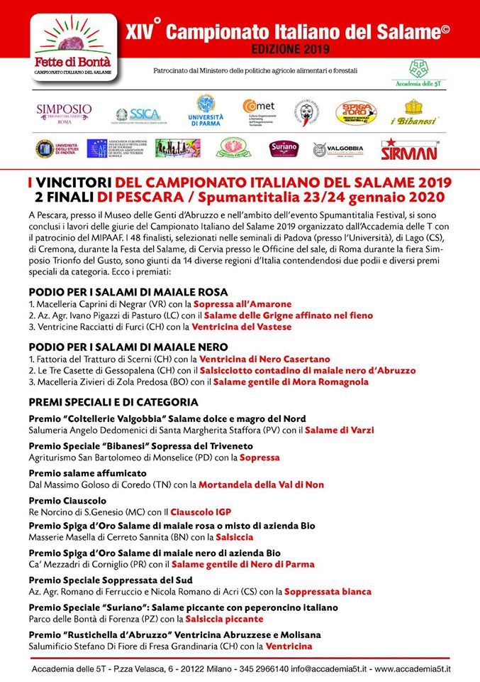 Le finali del Campionato Italiano del Salame 2019, evento ormai consolidato dell’Accademia delle 5T con il patrocinio del Mipaaf e la collaborazione di diverse prestigiose realtà accademiche e didattiche, si è svolto a Pescara nell’ambito del Festival Spumantitalia 2020.