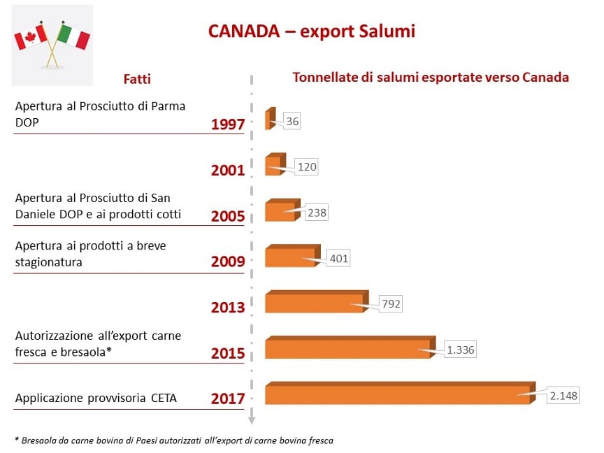 Un Paese, il Canada, che apprezza molto i salumi italiani. Basti pensare che nel 1997, anno di apertura del mercato canadese al solo Prosciutto di Parma, le esportazioni erano di appena 38 tonnellate, per diventare 238 nel 2005 con l’apertura al Prosciutto di San Daniele e ai prodotti cotti e oltre 400 tonnellate nel 2009, anno di apertura ai prodotti a breve stagionatura; e così via fino a raggiungere nel 2017 – anno dell’entrata in applicazione provvisoria del Ceta – l’importante traguardo delle 2.148 ton (+39,4% rispetto al 2016) per un valore di 25,9 milioni di euro (+43,5%). Un trend di crescita, questo, che prosegue nel primo trimestre dell’anno in corso in cui le nostre esportazioni di salumi in Canada hanno raggiunto quota 455 ton (+8,2%).