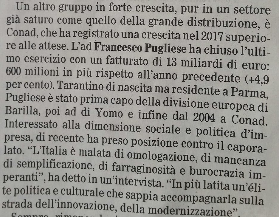 Un altro gruppo in forte crescita, pur in un settore già saturo come quello della grande distribuzione, è Conad, che ha registrato una crescita nel 2017 superiore alle attese. L’Ad Francesco Pugliese ha chiuso l’ultimo esercizio con un fatturato di 13 miliardi di euro: 600 milioni in più rispetto all’anno precedente (+4,9 per cento). Tarantino di nascita ma residente a Parma, Pugliese è stato prima capo della divisione europea di Barilla, poi Ad di Yomo e infine dal 2004 a Conad. Interessato alla dimensione sociale e politica d’impresa, di recente ha preso posizione contro il caporalato. “L’Italia è malata di omologazione, di mancanza di semplificazione, di farraginosità e burocrazia imperanti”, ha detto in un’intervista. “In più latita un’élite politica e culturale che sappia accompagnarla sulla strada dell’innovazione e della modernizzazione”.