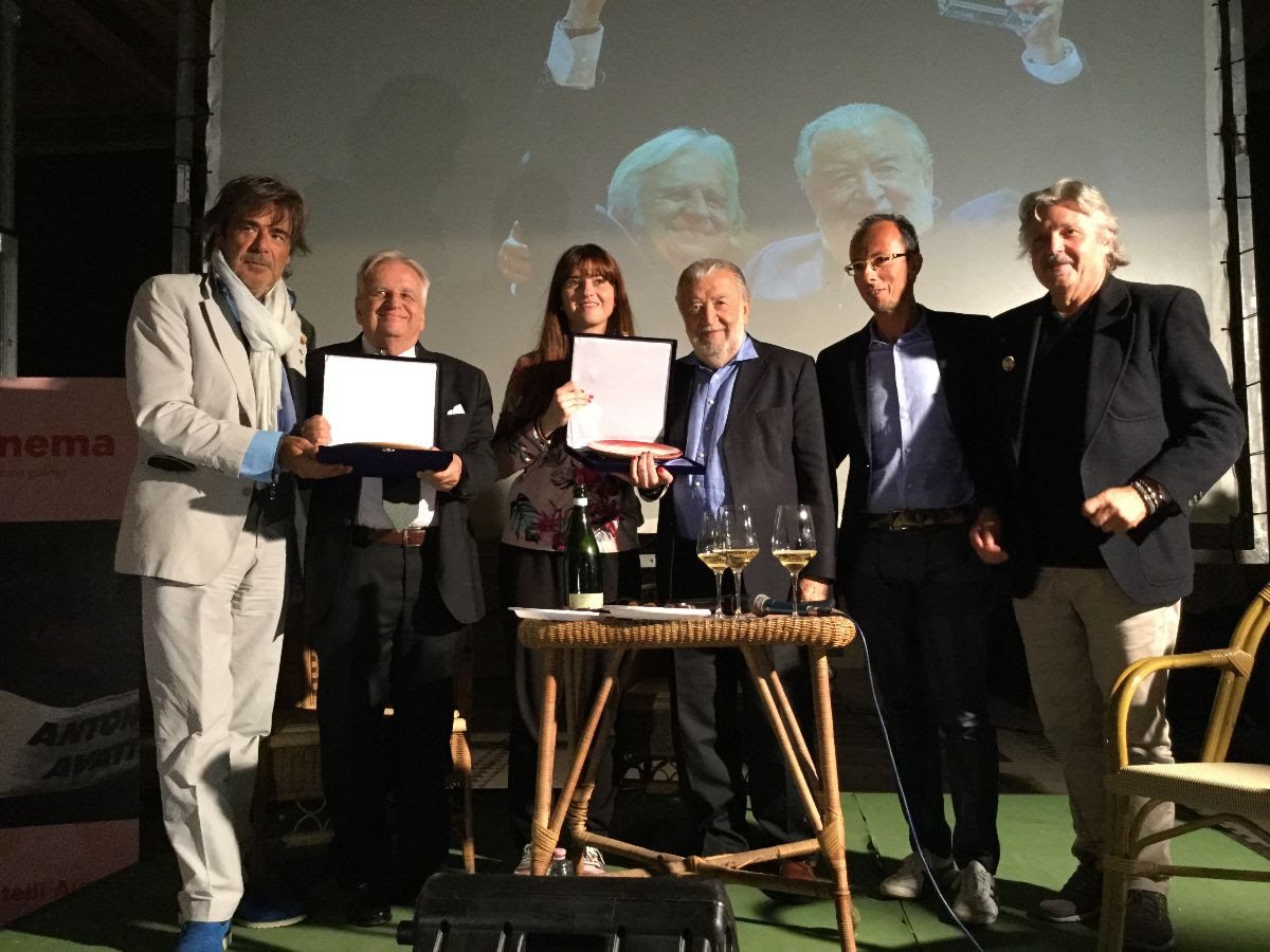 Il Premio Mangiacinema – Creatori di Sogni consegnato nel 2018 a Pupi e Antonio Avati (realizzato dall’artista Giuseppe Previtali, a destra nella foto)