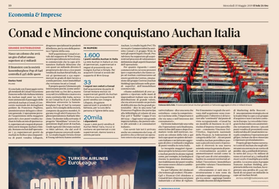 Conad compra Auchan Italia e sfida Coop. Pugliese: «Spinta al made in Italy» (Corriere della Sera L’Economia)