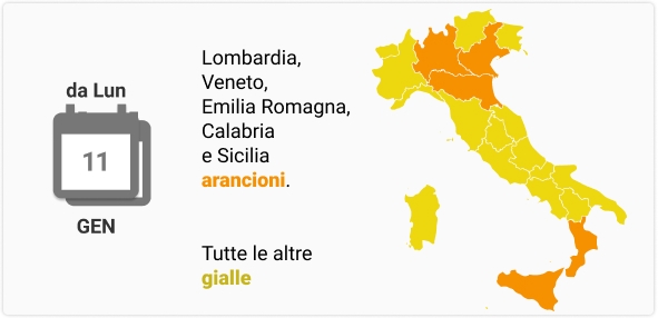 Da domani, lunedì 11 gennaio, dopo il passato weekend che è stato “arancione” per tutti, Lombardia, Veneto, Emilia-Romagna, Calabria e Sicilia (25 milioni di abitanti in tutto) resteranno “arancioni” almeno fino a venerdì 15 gennaio, quando scadrà il Dpcm in vigore e il governo dovrà farne un altro.