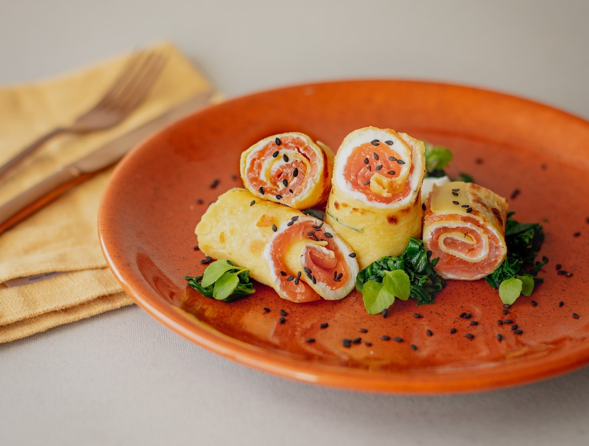 Perfette anche per un pranzo primaverile o una cena elegante, queste crespelle giocano sul contrasto tra la cremosità della robiola, il gusto sapido del salmone affumicato e la delicatezza delle erbette, per un piatto semplice ma d’effetto.
