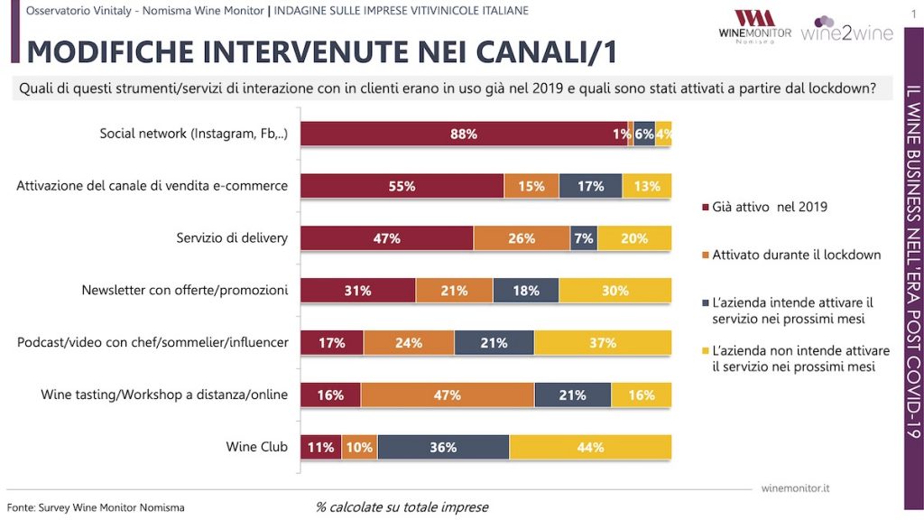 Anche sulle principali strategie post-Covid i produttori parlano una lingua nuova, per un settore che sino a oggi si è evoluto più in campo e nel bicchiere che negli uffici. In primo piano, il giusto mix di presenza (alle fiere internazionali), l’ulteriore potenziamento dei canali online e dell’enoturismo, il potenziamento nel canale Gdo (in costante crescita) e le immancabili masterclass online.