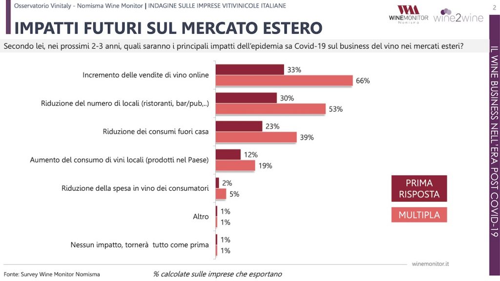 La certezza generale è che nei prossimi 2-3 anni cambierà tanto (solo l’1% dichiara che tutto tornerà come prima), mentre le opinioni più diffuse prevedono riduzioni, in Italia e all’estero, del numero di locali e dei consumi fuori casa, a cui contrapporre l’impatto positivo dato dall’incremento delle vendite online e dall’aumento della domanda di vini autoctoni, biologici, sostenibili.
