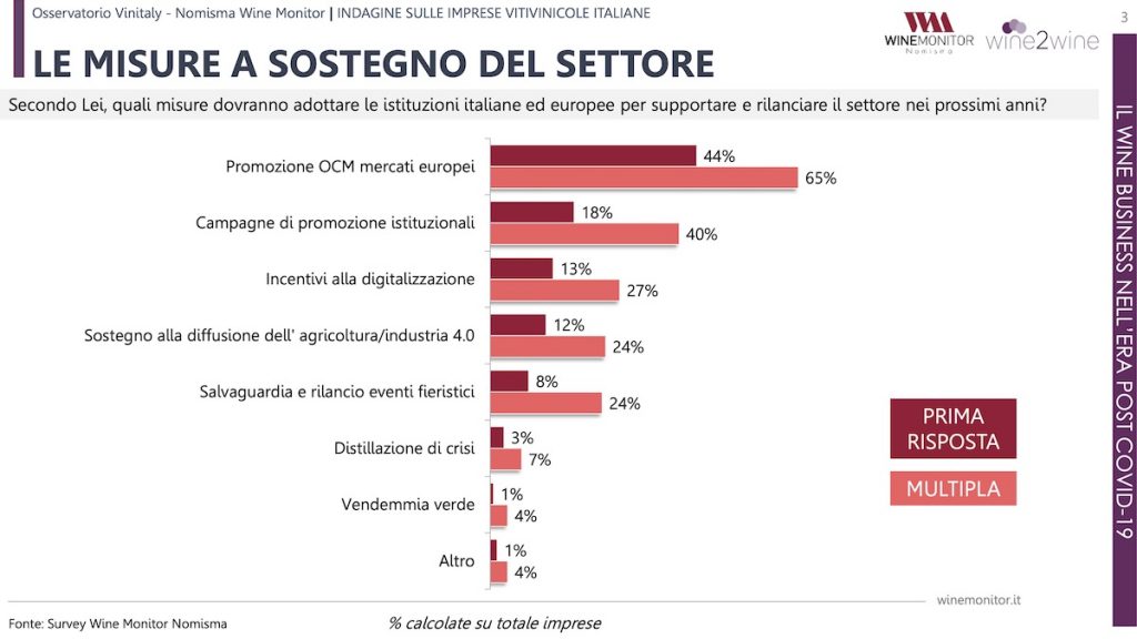 Tra le misure di sostegno richieste alle istituzioni per far ripartire il settore, al primo posto figurano i fondi dell’Ocm promozione, da poter utilizzare non più solo sui Paesi extra-Ue ma anche sui mercati europei (65%). Una istanza, questa, a sostegno dei mercati di prossimità, che stanno soffrendo più di altri.