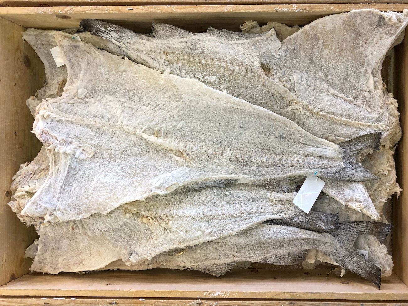 Stoccafisso: essiccato all’aria artica senza sale, è duro, rigido, va reidratato prima dell’uso;