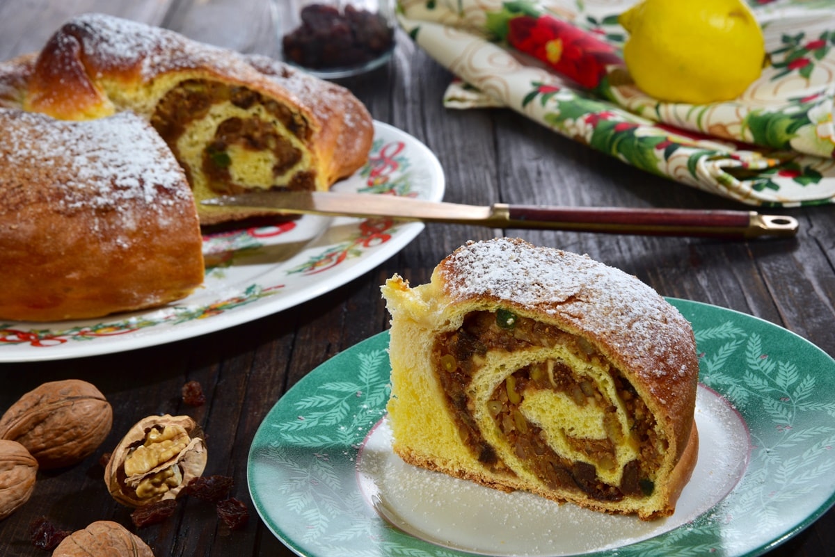 Originaria di Udine, questa ciambella a base di pasta lievitata e cotta al forno è ripiena di burro, zucchero, uova e un tripudio di ingredienti golosi: noci, uvetta, pinoli, mandorle, scorze di cedro e arancia canditi, cioccolato e grappa.