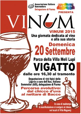 Domenica 20 Settembre a partire dalle ore 16 sino al tramonto nel prestigioso Parco della Villa Meli Lupi Tarasconi a Vigatto (Parma) si svolgerà il consueto appuntamento annuale con “Vinum”, promosso dall' AIS di Parma e divenuto momento d’incontro di winelover e gastronomi provenienti anche da fuori provincia e regione.