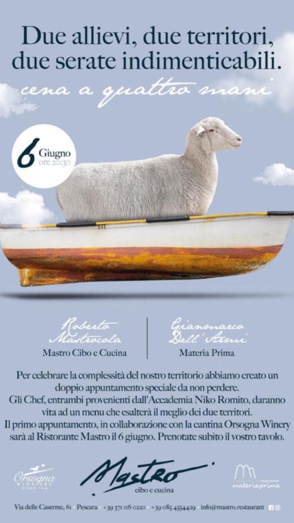 La prima delle due cene che celebra la complessità dell’Abruzzo avrà luogo a Pescara giovedì 6 giugno al ristorante Mastro dello chef Mastrocola, per poi replicare a fine estate a Castel di Sangro (ne riparleremo) presso il ristorante di Gianmarco Materia Prima. I due giovani chef sono entrambi Niko’s Boys appellativo con il quale la stampa gastronomica ha ribattezzato gli ex allievi dell’Accademia Niko Romito. Entrambi giovanissimi e innamorati del proprio lavoro hanno deciso di organizzare queste due cene a 4 mani con l’obiettivo di rappresentare entrambi il proprio territorio di appartenenza e le materie che lo contraddistinguono. Nella prima cena, che sarà accompagnata dai vini di Cantina Orsogna Winery si alterneranno ben 7 portate, 3 a cura di Roberto e 3 a cura di Gianmarco che si occuperà anche del dolce.
