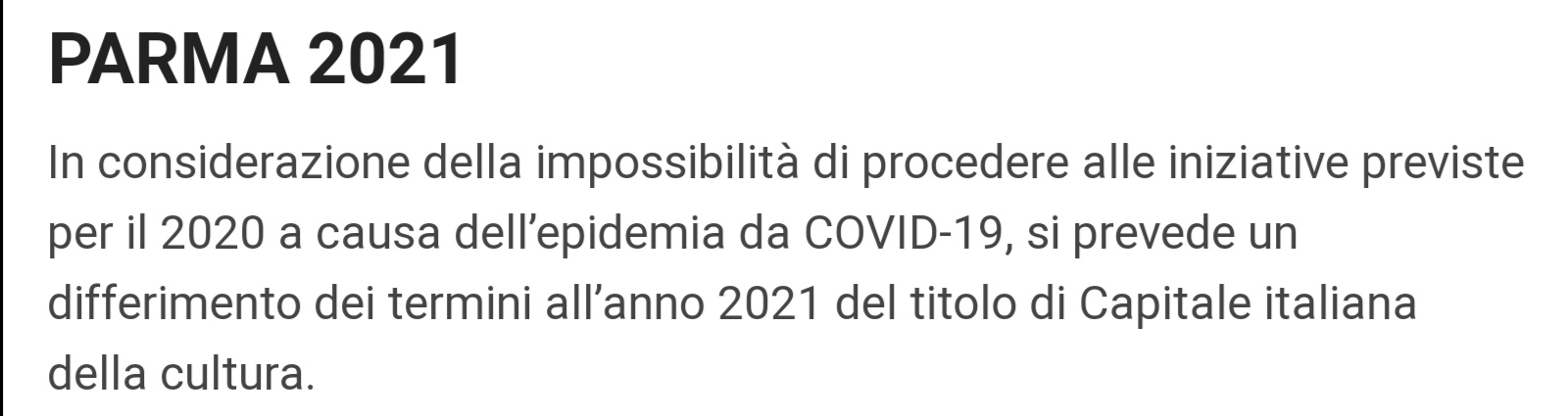 “PARMA 2021. In considerazione della impossibilità di procedere alle iniziative previste per il 2020 a causa dell’epidemia da COVID-19, si prevede un differimento dei termini all’anno 2021 del titolo di Capitale italiana della cultura”, così è scritto nel decreto Rilancio che il consiglio dei ministri approverà in settimana insieme ad una serie di altri provvedimenti: il fisco, con nuovi rinvii delle scadenze di pagamento; il lavoro, con la proroga degli ammortizzatori sociali; le imprese, con i ristori a fondo perduto; le famiglie, con il Reddito di emergenza; i trasporti, con il bonus per la mobilità sostenibile, incentivi per il turismo.