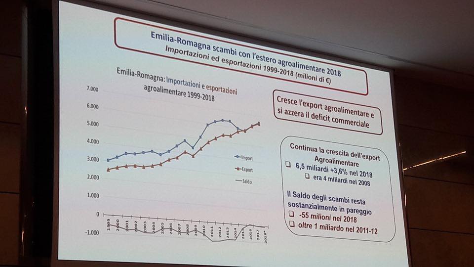 Nel 2018 è proseguito il trend favorevole dell’export agroalimentare, per un controvalore di quasi 6,5 miliardi di euro (+3,6%), pari al 10,2% del totale delle vendite all’estero delle imprese emiliano-romagnole. Cresce pure l’import, che arriva a toccare quota 6,55 miliardi di euro (+4,1%), con la bilancia commerciale che finisce in sostanziale pareggio.
