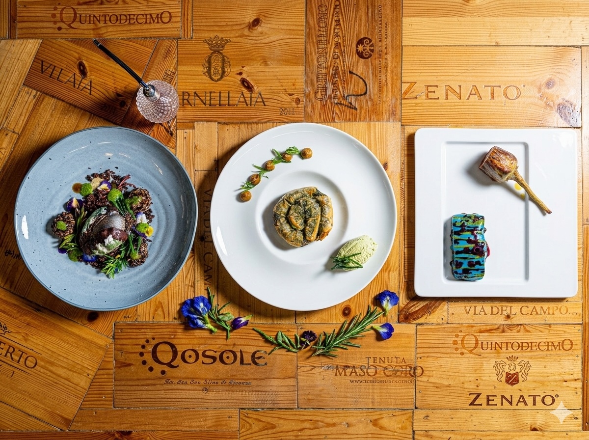 Nel Burek vegetale (pasta fillo, erbe di laguna, Asiago mezzano) la selvaticità delle alofite dialoga con la dolcezza del formaggio in un equilibrio che fa capire quanto lavoro ci sia dietro a qualcosa che sembra semplice. Nell’Ombrina al dripping di Laguna il piatto diventa quasi un’opera visiva: i colori della salicornia, del nero di seppia, del kimchi di radicchio rosso di Chioggia si sovrappongono come strati di una laguna vista dall’alto.