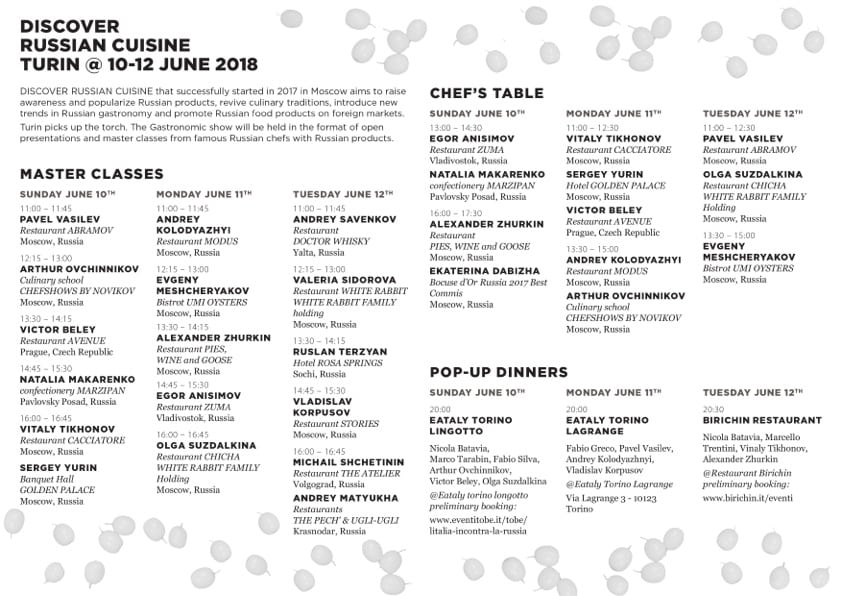 A Torino è stato pensato un ricco programma di eventi per dare modo ai visitatori di Gourmet Expoforum di provare le specialità russe preparate da un dream team di tutta eccezione composto da chef del calibro di Sergey Eroshenko del ristorante “Chestnaya Kuhnya”; Arthur Ovkinnikov, vincitore del Bocuse d’Or Russia nel 2015; Vitaly Tikhonov, vincitore del Taste Of The World 2016 ad Abu Dhabi; Egor Anisimov del ristorante “Zuma” di Vlasivostok.