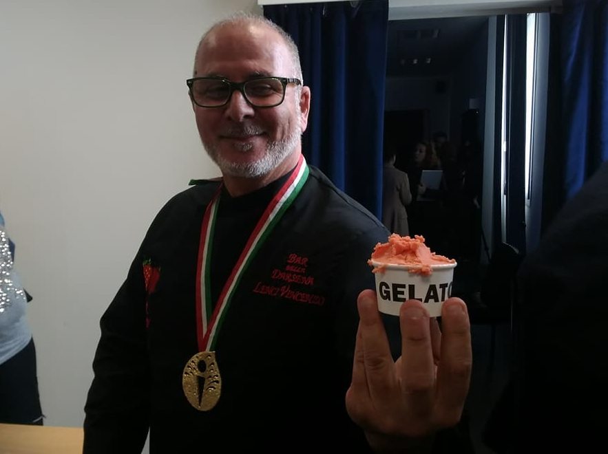 Il gelatiere Vincenzo Lenci con il gelato dal gusto stravagante “peperone rosso e fragole”