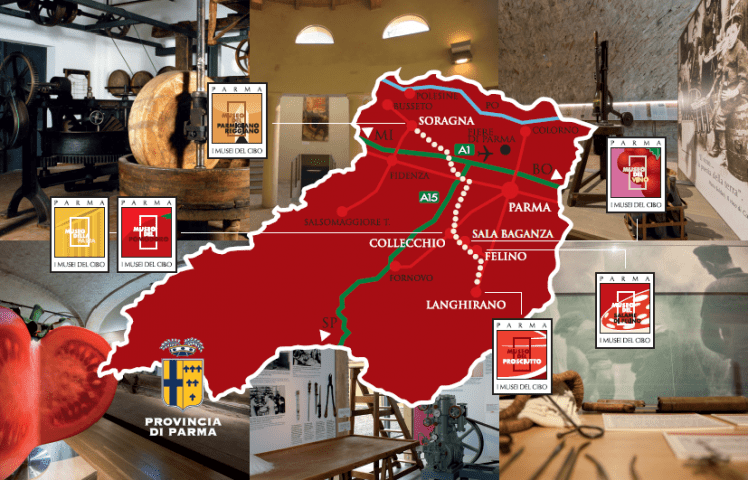 I musei – Musei di Qualità della Regione Emilia-Romagna – costituiscono un circuito dedicato ai prodotti tipici del territorio e sono collocati in splendide sedi espositive come dimore storiche o ex luoghi di produzione suggestivi. È il caso del caseificio della metà dell’Ottocento a pianta circolare a Soragna, unico al mondo o della “Corte di Giarola” a Collecchio, Grancia Benedettina risalente all’anno Mille, sorta lungo il tracciato della Via Francigena. E poi la Rocca di Sala Baganza della seconda metà del 1200, il trecentesco Castello di Felino e infine l’ex Foro Boario di Langhirano, ampia costruzione ad arcate in sasso e cotto.