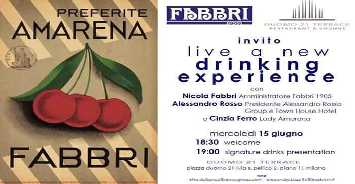 Milano giugno 2016. Drinking Experience Fabbri 1905: mercoledì 15 giugno dalle ore 18,30 sulla Terrazza di Duomo 21, nell'elegante spazio in Piazza Duomo 21, al primo piano di un palazzo storico della Galleria Vittorio Emanuele II, si terrà uno speciale appuntamento, riservato alla stampa, per gustare le ultime novità Fabbri oltre ai cocktails della linea di sciroppi aromatici Mixybar della pluripremiata azienda bolognese.