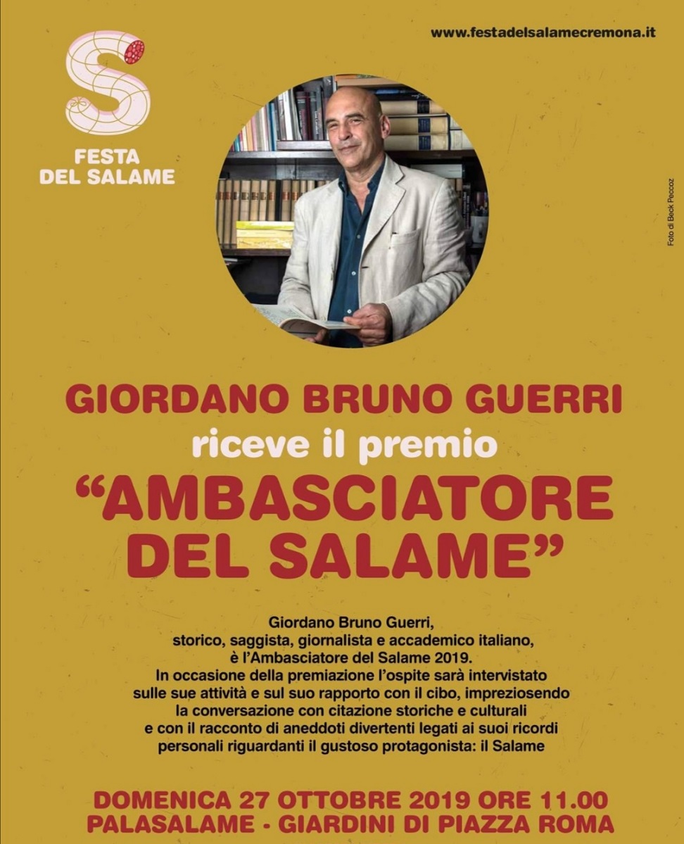 Durante la giornata di chiusura, domenica 27 ottobre, verrà conferito il Titolo di Ambasciatore del salame a Giordano Bruno Guerri
