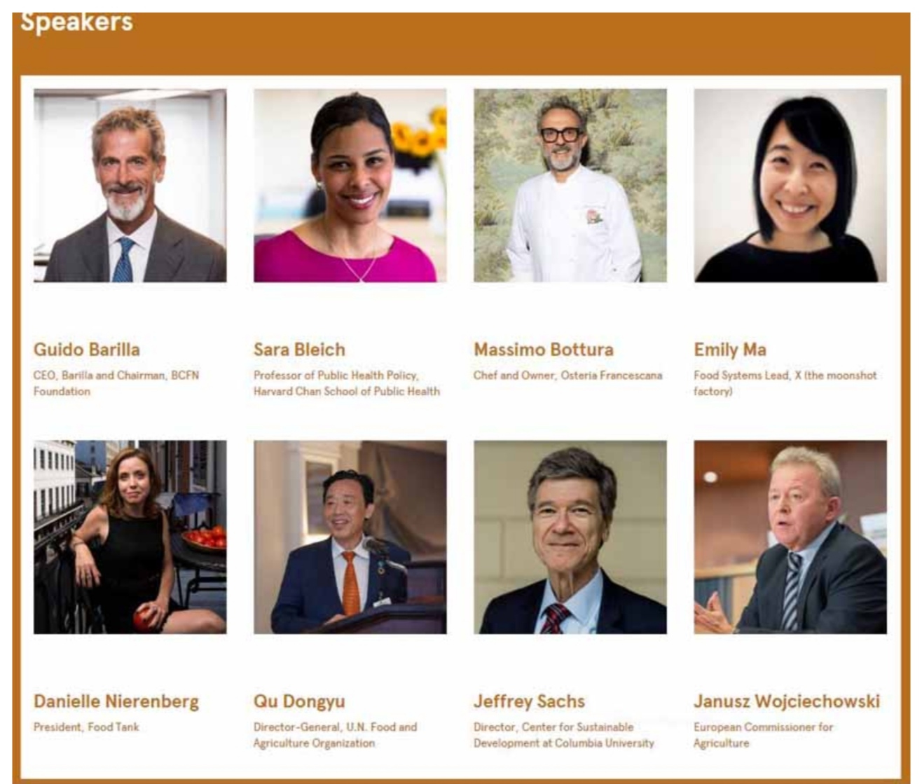 Ecco i nomi di alcuni partecipanti: lo chef Massimo Bottura, proprietario dell’Osteria Francescana e creatore del Refettorio Ambrosiano; il Commissario Europeo per l’Agricoltura, Janusz Wojciechowski; il rappresentante italiano dell’Executive Board dell’OMS, Walter Ricciardi; il docente della Cornell University e caporedattore di Food Policy, Chris Barrett; la docente di Public Health Policy alla Harvard Chan School of Public Health nel dipartimento di Health Policy and Management, Sara Bleich; il vicepresidente di Slow food international e co-fondatore del progetto “Developing Innovations in School and Community Cultivation”, Edie Mukiibi.
