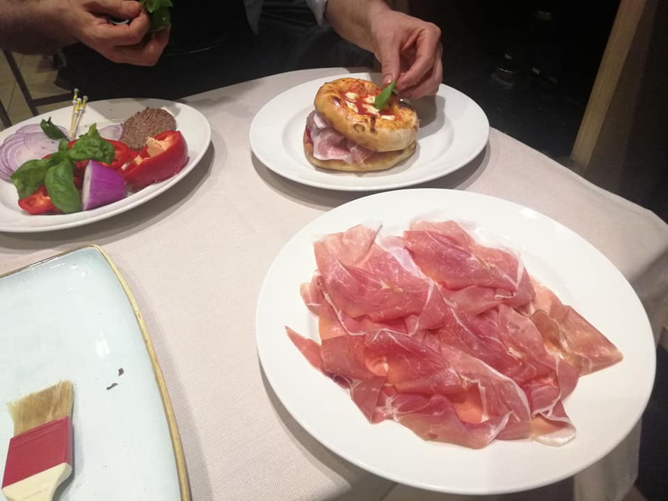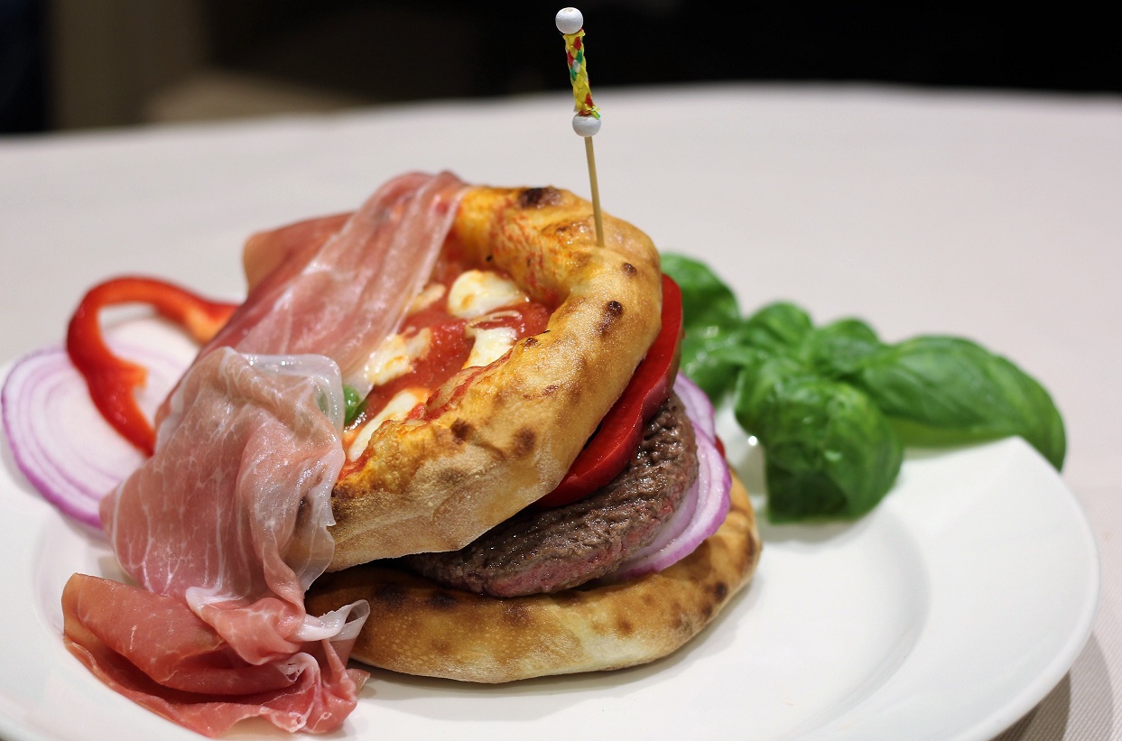 Preparare due pizzette stile margherita con salsa di pomodoro e mozzarella fiordilatte Dop, farcire con peperone crudo, cipolla rossa di Tropea, adagiare un hamburger alla volta, coprire con l’altra pizza alla fine adagiare il Prosciutto di Parma.