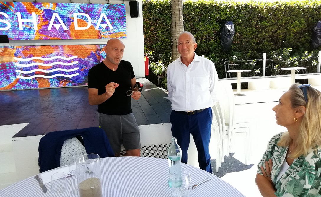 Inaugurazione sul Lido di Civitanova “Shada”. Il patron Aldo Ascani mentre lo illustra ad Angelo Serri e a Carlotta Tenneriello, giornalista di TgCom 24