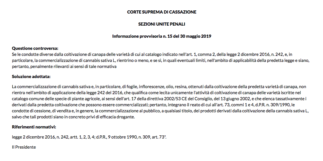 Il 3 giugno Federcanapa ha rilasciato un’ulteriore nota di commento alla sentenza della corte di Cassazione.