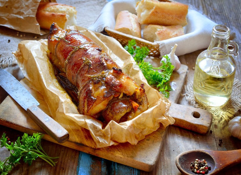 Il Prosciutto di Parma per il menu di Natale è protagonista di un grande piatto della tradizione: l’arrosto ripieno. Fatevi aprire a libro dal macellaio il pezzo di carne che vorrete arrostire. Farcitelo con fette di prosciutto crudo, rosmarino, aglio tritato se piace, pepe e un po’ di formaggio grattugiato. Chiudete la carne con dello spago per arrosto, ungetela con olio e timo e cuocete in forno una mezz’oretta assieme a mezzo bicchiere di vino rosso. Tagliatelo a fette quando si è raffreddato e prima di servire in tavola fate addensare il sughetto cuocendolo a fuoco vivo con un cucchiaio di farina. Servite ben caldo con la sua salsa.