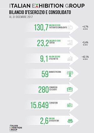 L’esercizio 2017 del Gruppo IEG si è chiuso con un fatturato consolidato pari a 130,7 milioni di euro. Il Margine Operativo Lordo (Ebitda) al 31 dicembre 2017 ammonta a 23,2 milioni mentre l’Utile Netto consolidato è di 9,1 milioni di euro. Nel 2017, nel complesso delle sedi espositive e congressuali di Rimini e Vicenza, IEG ha totalizzato 59 manifestazioni, 280 tra congressi ed eventi, 15.649 espositori, 2.648.675 visitatori. La capogruppo IEG S.p.A. ha chiuso l’esercizio 2017 con 109,4 milioni di euro di ricavi e un Utile Netto di 8,7 milioni. L’Assemblea degli Azionisti ha deliberato la distribuzione di un dividendo lordo di 0,18 euro, con un dividend payout ratio del 63,6%, che verrà messo in pagamento entro il 31 luglio 2018; l’utile non distribuito, pari a circa 3,1 milioni di euro viene accantonato a Riserve.