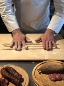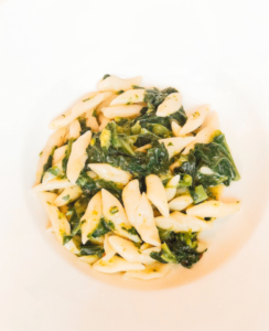 “Questo piatto nasce dai pastori di un tempo, durante la  transumanza. A Foggia, in Puglia, c’erano le orecchiette con le cime di rapa. Da quello presero l’ispirazione, “importarono” questa ricetta in Abruzzo” spiega lo chef “Ma anzichè le orecchiette, fecero i cazzelletti: degli gnocchetti  sottili ma carrati. Nel periodo delle cime rapa si fanno con quelli ma se no si fanno tutto l’anno i “cazzelletti con le foglie”, quindi con verdura di stagione”
