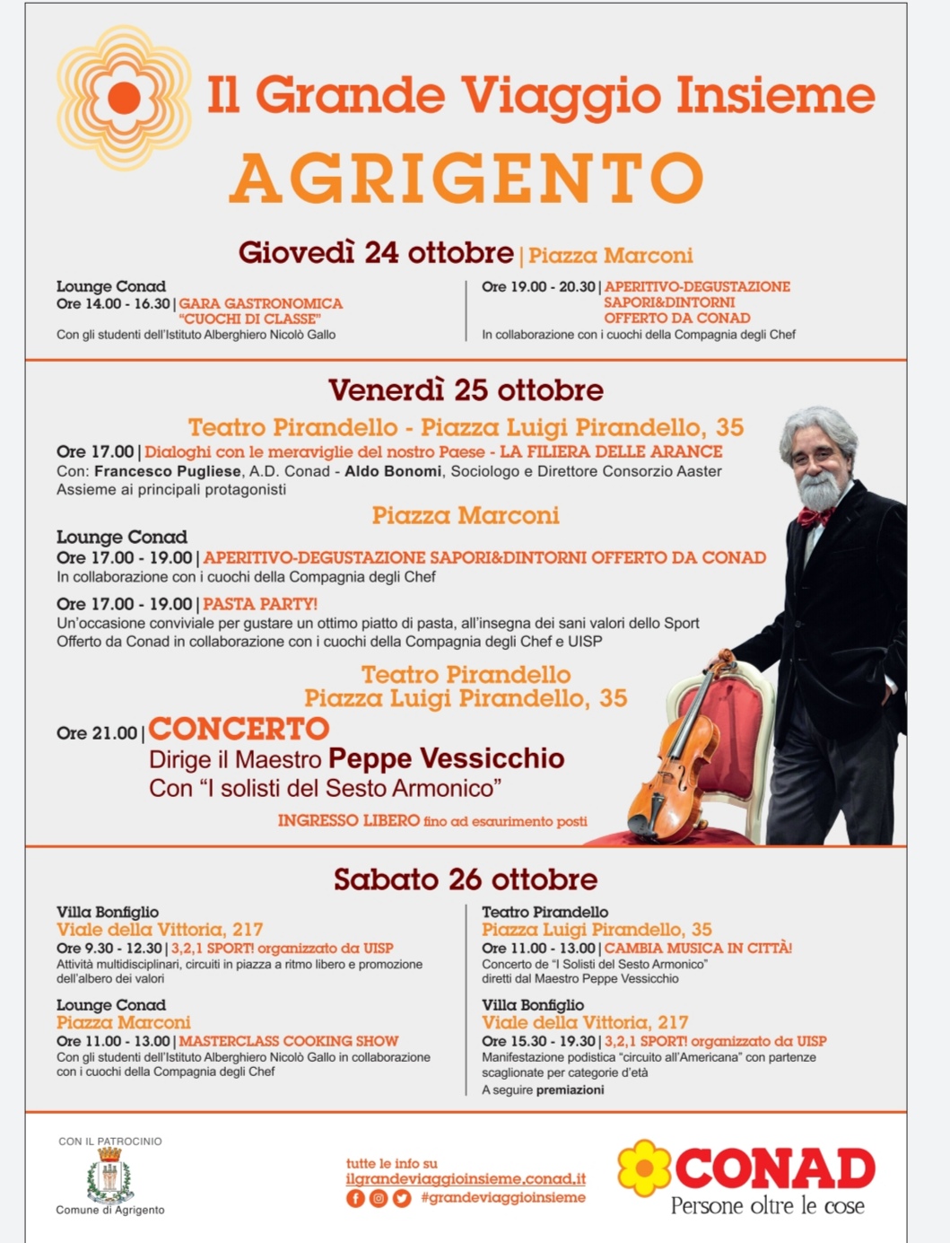 La tre giorni agrigentina inizia il giovedì tra i giovani, nelle scuole, dove Conad incontrerà gli studenti delle quarte e quinte classi dell’istituto professionale alberghiero “Nicolò Gallo”. Il sociologo Aldo Bonomi, insieme ad un rappresentante della Compagnia degli Chef, illustrerà loro i risultati dell’indagine condotta dall’istituto Aaster sulla filiera delle arance, filo conduttore anche di altri appuntamenti che animeranno la città. Un food truck targato Grande Viaggio Insieme sosterà, per tutta la durata del tour, in Piazza Marconi per diventare il set di laboratori culinari, aperitivi e degustazioni dei prodotti Sapori&Dintorni e Verso Natura.
