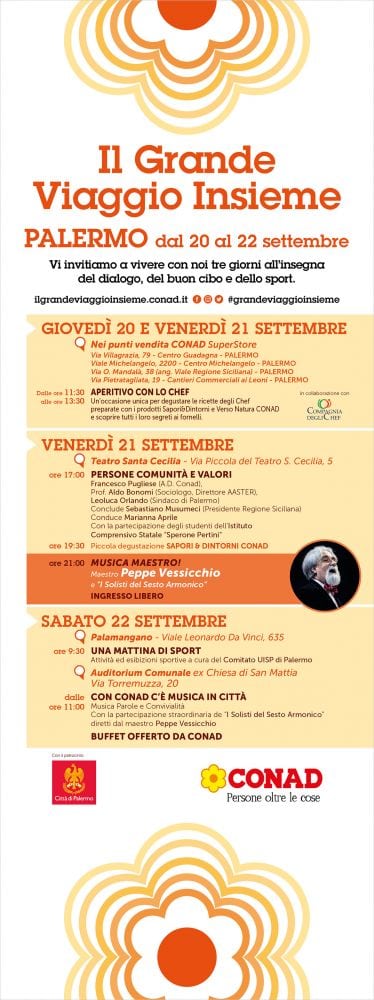Dopo la pausa estiva, il Grande Viaggio Insieme, targato Conad, riparte dal 20 al 22 settembre e fa tappa di nuovo tappa in Sicilia, a Palermo.