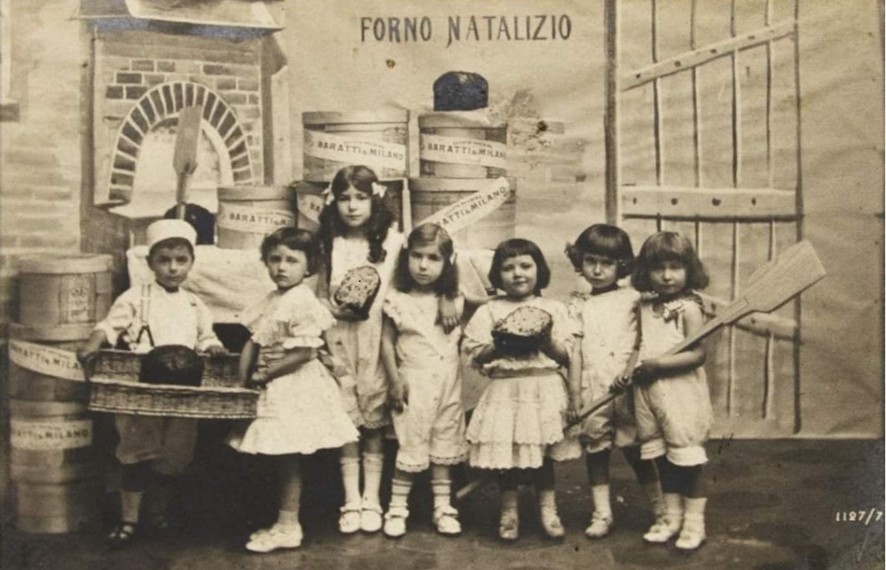 La prima è una cartolina vintage che vede raffigurati tre piccoli cuochi che, operosi, portano le loro prelibatezze su grandi vassoi, tutti in fila sulla neve. Al centro, preceduto e seguito da ricche preparazioni, c’è il panettone, re delle feste, che solennemente viene portato sulle tavole, quasi in processione.