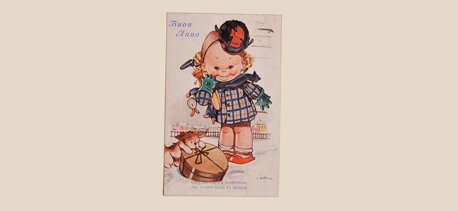 Non meno interessante è la seconda cartolina che abbiamo scelto, la più bella di questa selezione. Un esemplare degli anni Venti o Trenta, vero documento di un’epoca e dei suoi gusti. La bambina, ben vestita e con in mano un pupazzo ed un ombrellino, fa cadere nella neve una scatola di panettone. Quest’ultima, altro non è che un’elegante cappelliera ben legata, testimonianza della sua diffusione e dell’unione con la specialità dolciaria.